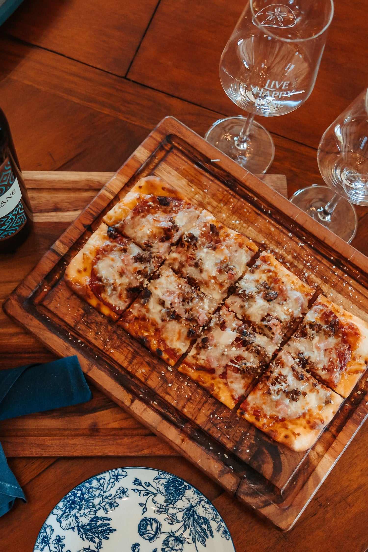Our flatbreads are a perfect pairing for your wine tasting. Each flatbread is baked to a golden brown and sliced into shareable pieces, making it an ideal choice for a light lunch or an afternoon snack. Paired with a bottle of our wine, it's a simple and delicious way to enjoy your time with us.